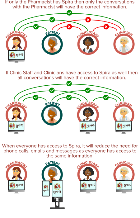 Spira allows conversations (or emails) to be fully documented so everyone in the pharmacy knows what has been said by Patients, Clinicians and Clinic Staff.