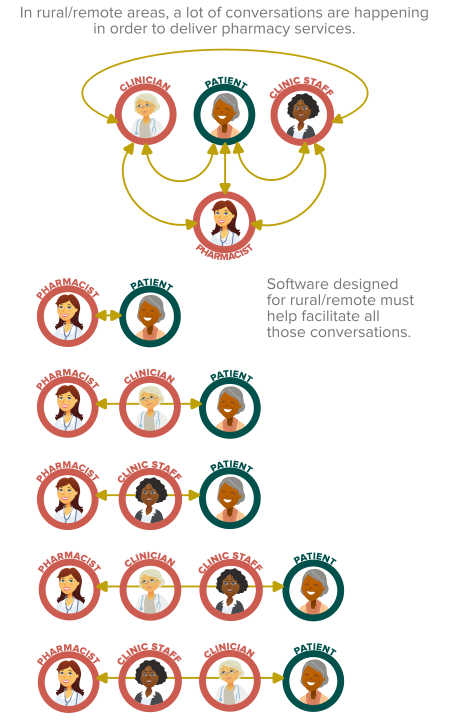 City-based pharmacies have a direct relationship patients because their patients walk into the pharmacy. In rural/remote areas, a large number of patients will never walk into a pharmacy. Pharmacy services are provided to patients through clinics and other clinicians.